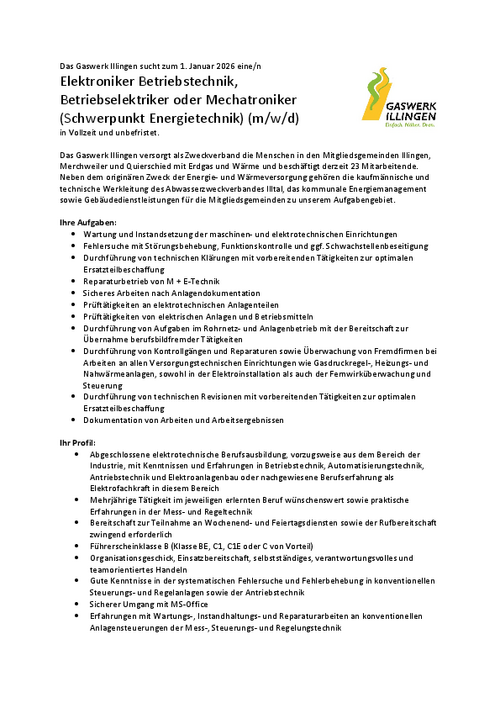 - Mehrjährige Tätigkeit im jeweiligen erlernten Beruf wünschenswert sowie praktische Erfahrungen in der Mess- und Regeltechnik